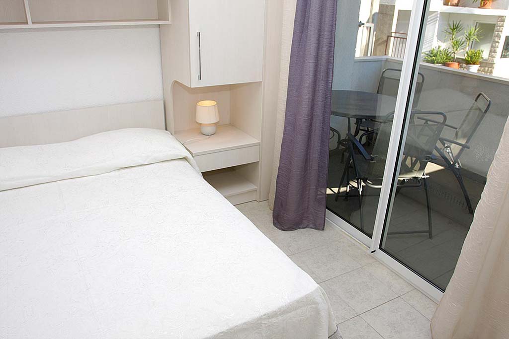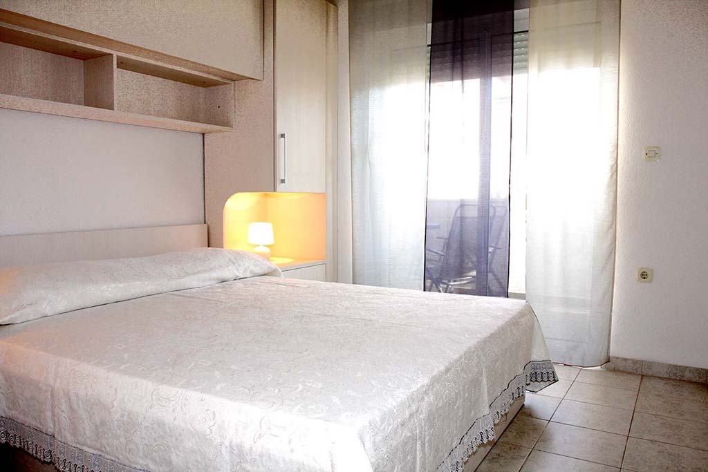 - SOBA: Dvokrevetna spavaća soba, bračni krevet 200 x 160 cm, garderobni ormar, izlaz na balkon iz sobe.