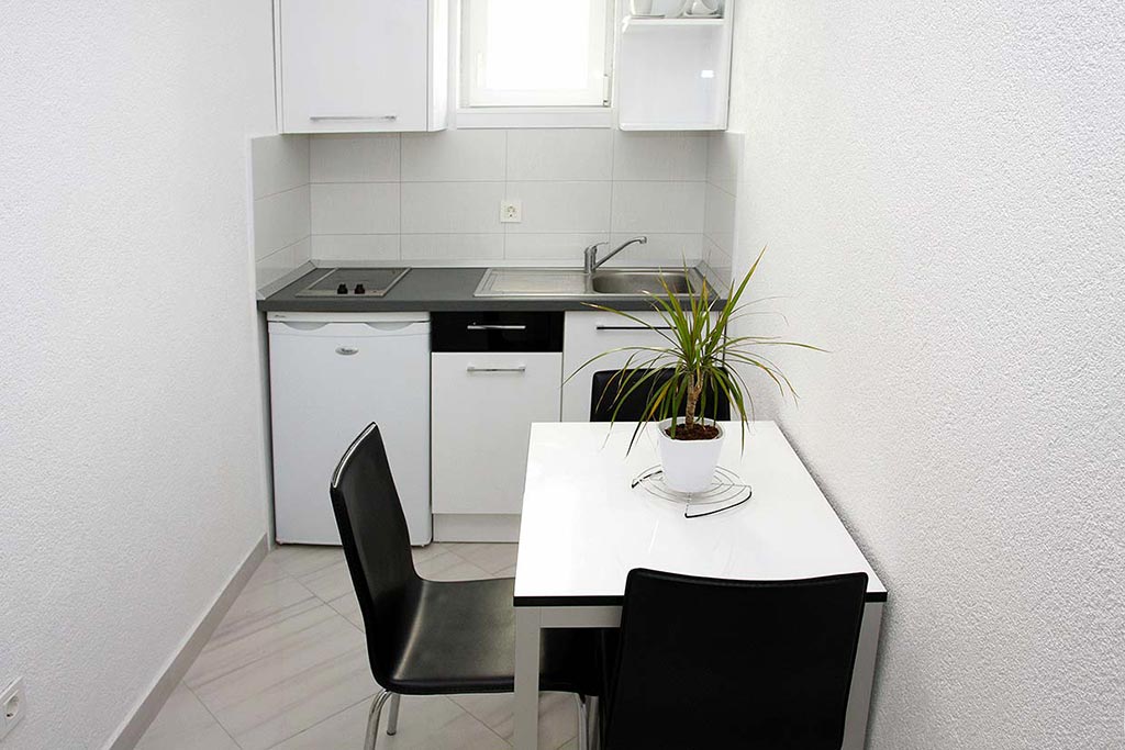- KUHINJA: Otvorena mini kuhinja u sklopu dnevne sobe, Štednjak (2 ploče za kuhanje), hladnjak, kuhalo za vodu, pribor za kuhanje, pribor za jelo i piće, stol i stolice.