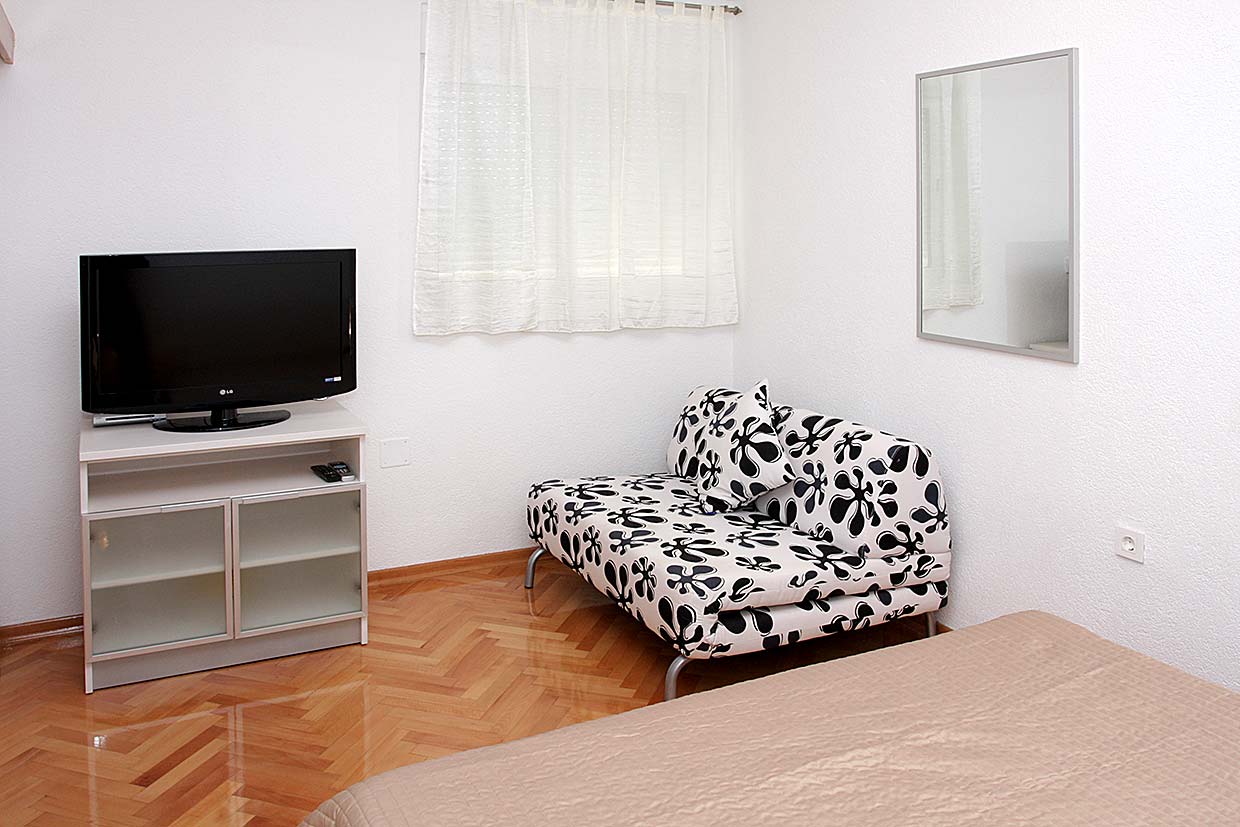- SOBA: Dvokrevetna spavaća soba, bračni krevet 200 x 160 cm, garderobni ormar, SAT-TV, WiFi-internet i klima uređaj.
